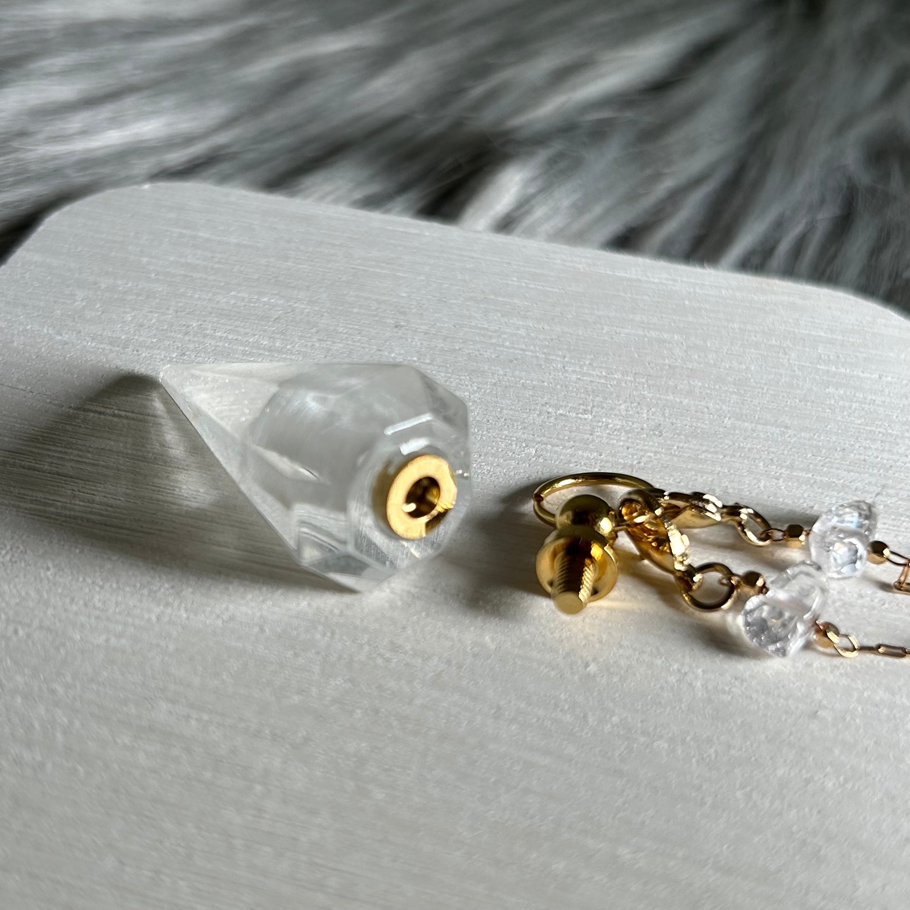 透明感が美しいペンデュラム型水晶の香水瓶とさざれ石チェーンのネックレスです。