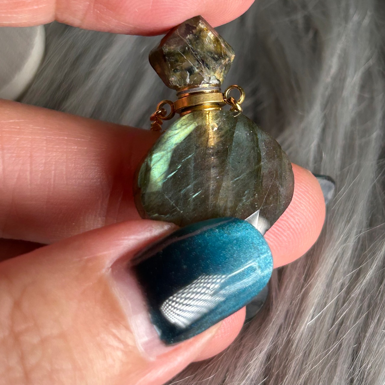 小さめのデザインで女性らしさが引き立つシンプルなラブラドライトのミニ香水瓶ペンダントです。